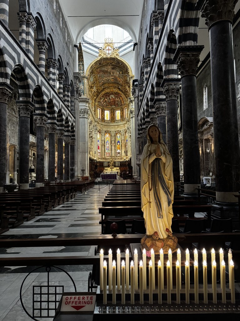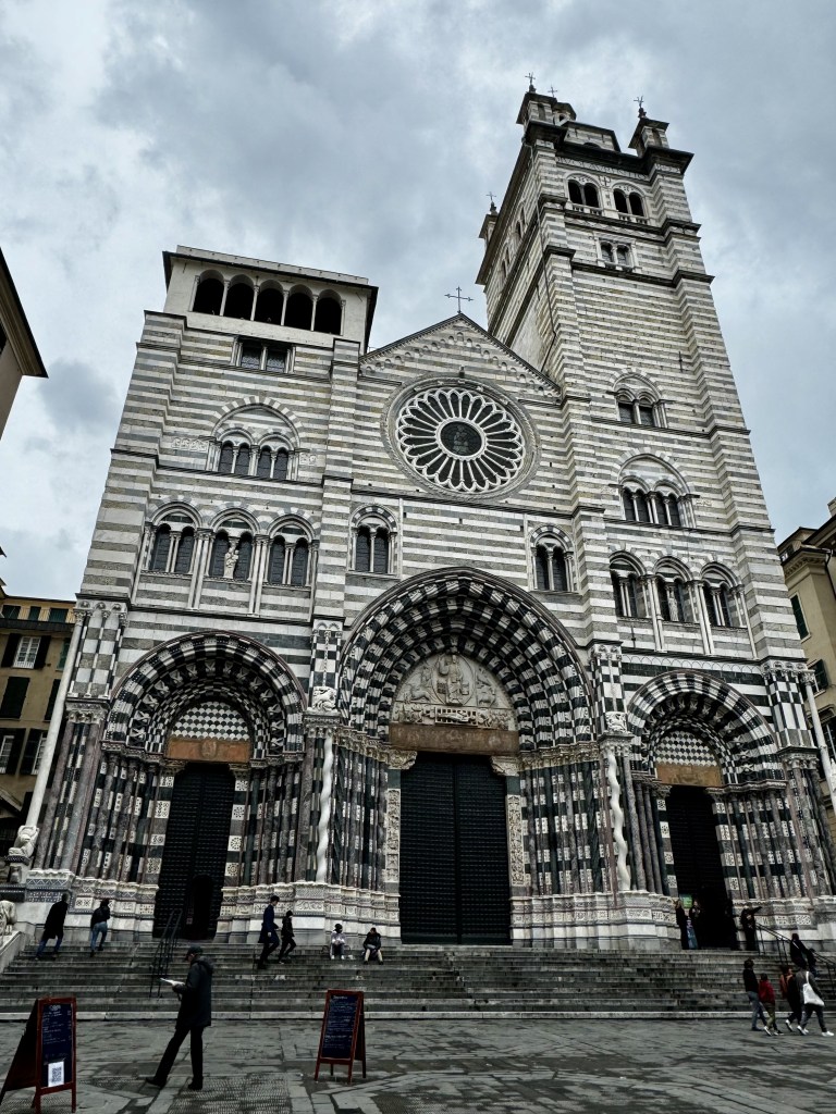 Do navio até o Porto Antico são 1.3Km. Devido tempo chuvoso, no desembarque contratamos táxi com motorista guia (€20pp por 2h). Nesse tour, paramos no Porto Antico, Mirante, Estádio Luigi Ferraris, Piazza de Ferrari e Catedral San Lorenzo