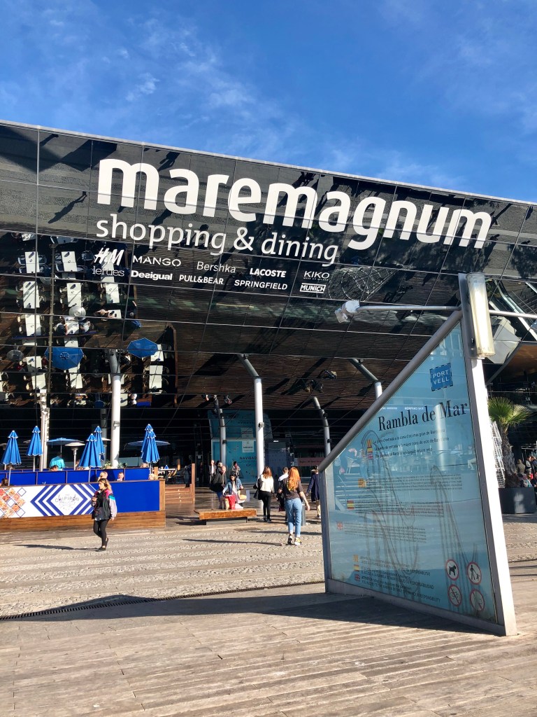 -Atravessando a ponte para pedestres chega no shopping Maremagnum, vários restaurantes com vista das águas.